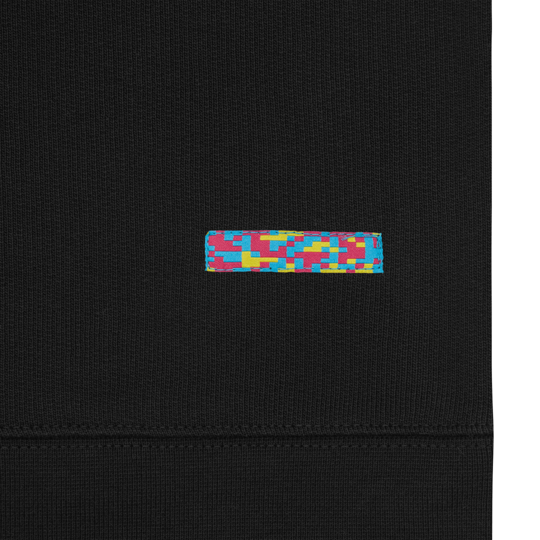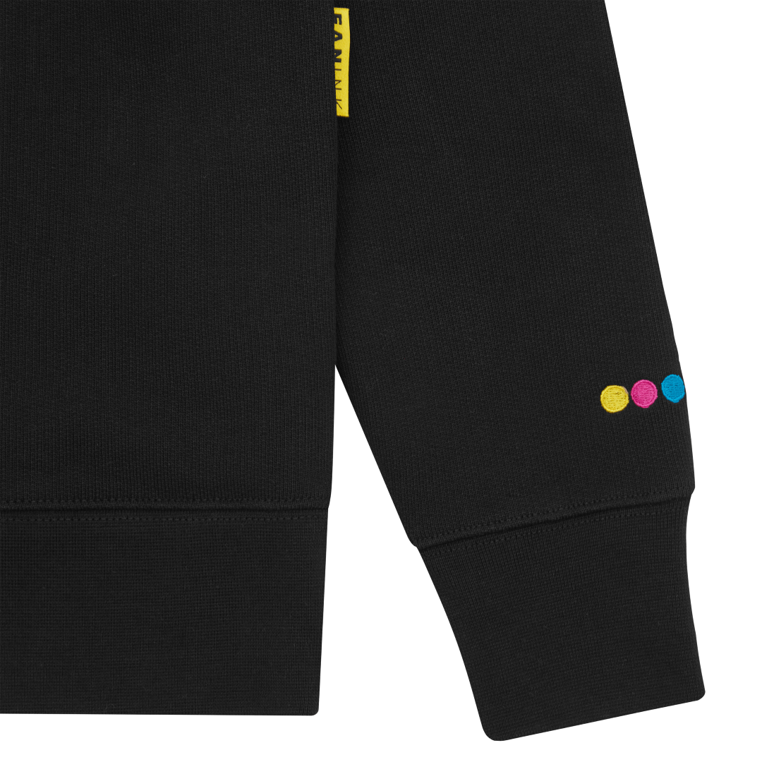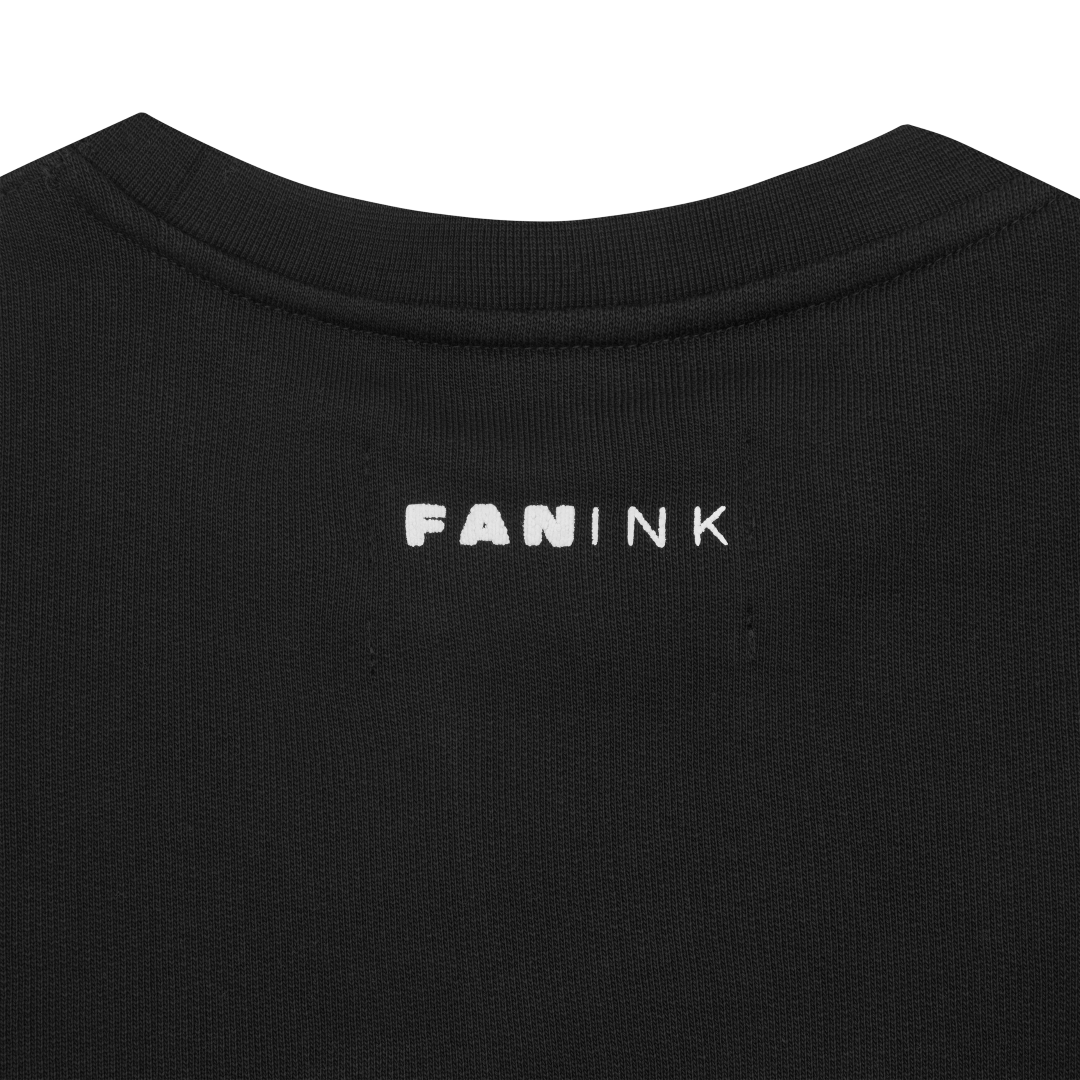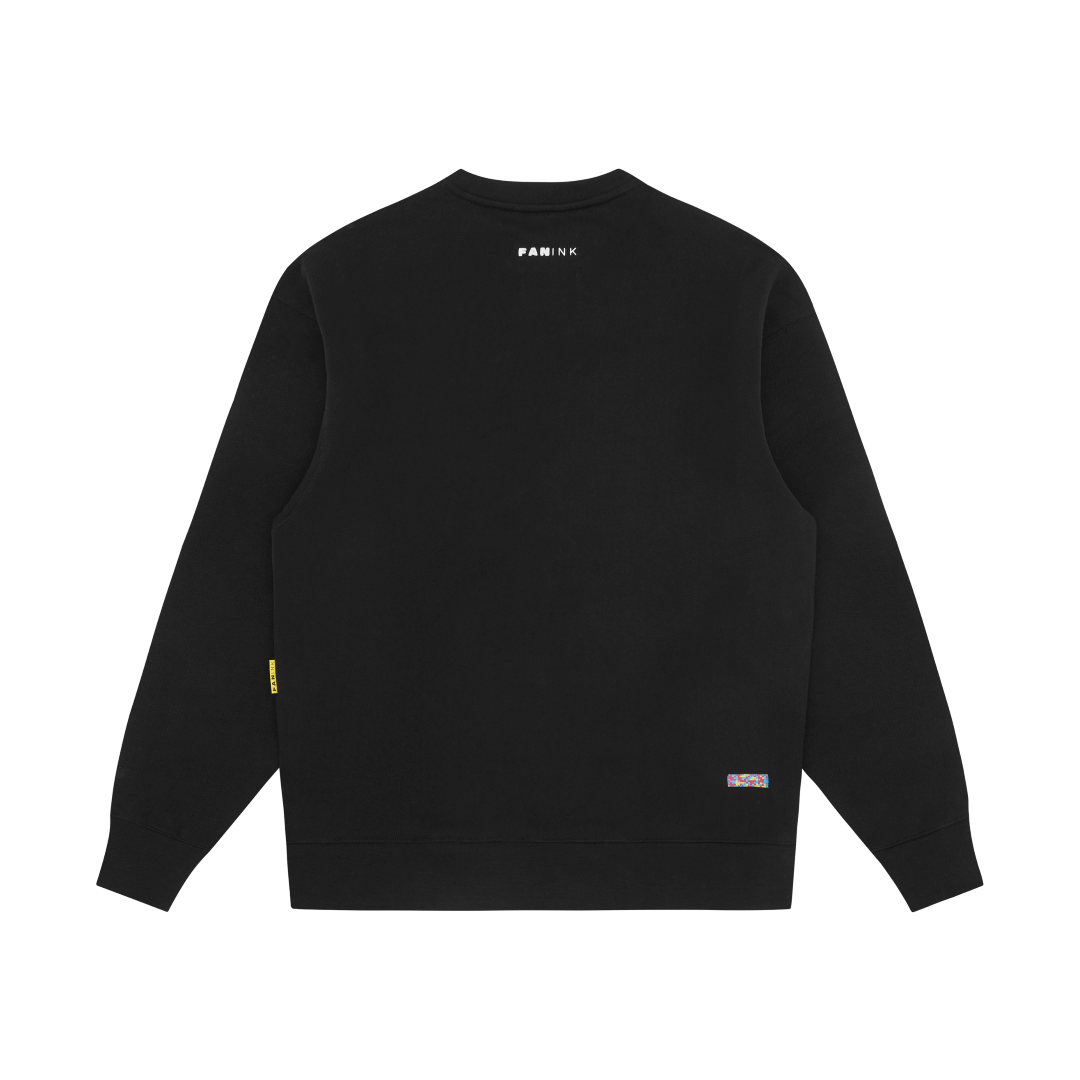 Crewneck sweatshirt. Fan Ink patch at left chest. Fan Ink colours embroidered at left sleeve. Fan Ink screen print at top back. Fan Ink woven label at side. Fan Ink digital camo label at back hem. Made in Portugal.
